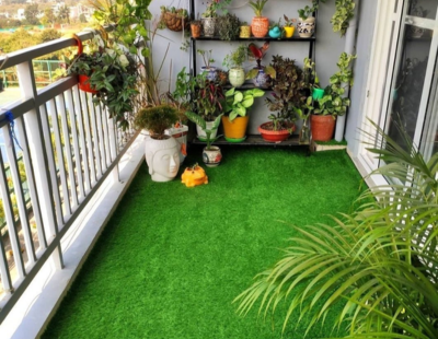 Transform your balcony into a cozy green retreat with soft turf underfoot.